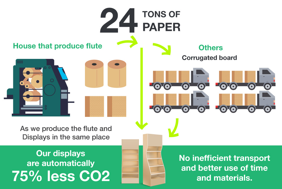 Avoiding and reducing waste to an absolute minimum is the best way to reduce CO2, VOC, decrease traffic on the roads, and to reduce our customers costs. We have a unique approach due to production of flute on our own corrugator with the choice of varying the width of the roll. Where others have to think about how to use the sheet fully, we never produce a larger sheet than absolutely needed. The same is done in the printing process; we produce sheets of specified sizes on our in-house sheet cutter. We proactively offer innovative solutions to keep waste to a minimum. We analyze each product and compare input and output while working with feedback to keep up on continuous improvement.